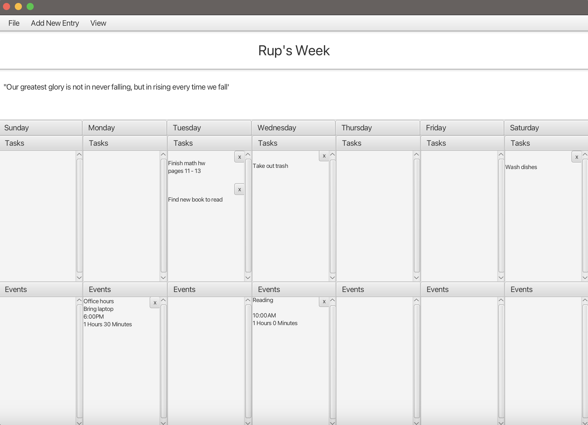 Bullet Journaling Java application to keep track of individual weeks. Each day of the week holds onto events and tasks for that day. Includes additional functionality as persistence, keyboard shortcuts, expandable task queue, mini viewer, etc.